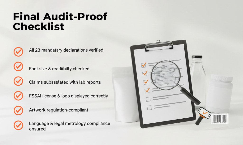 Before printing, verify your label against this audit-proof checklist to ensure full food label compliance India: