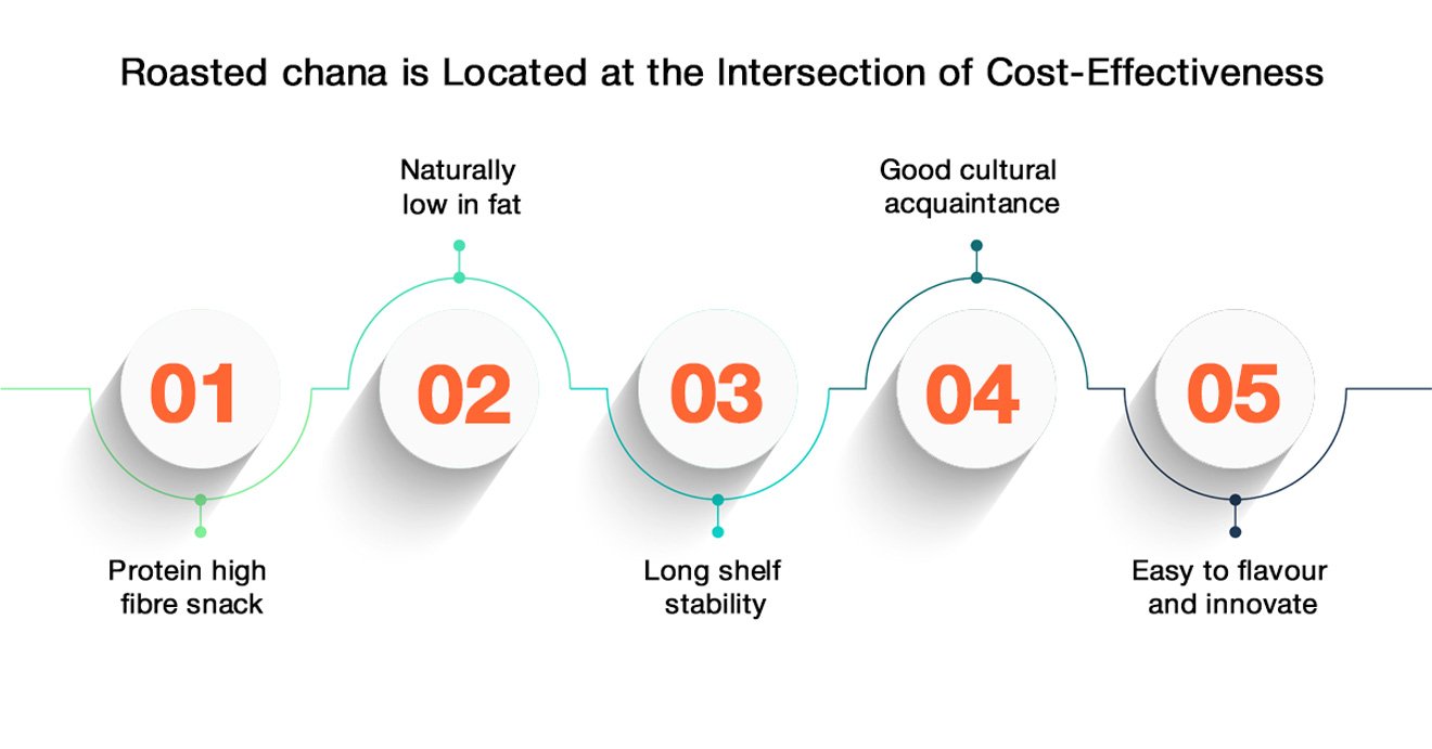 Roasted chana is located at the intersection of cost-effectiveness, nutrition, and the masses. It serves both the rural and urban markets, unlike niche health foods.