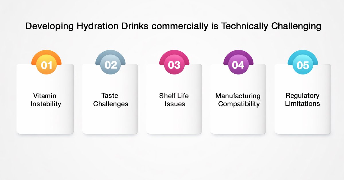 Developing hydration drinks commercially is technically challenging for a variety of reasons, including: