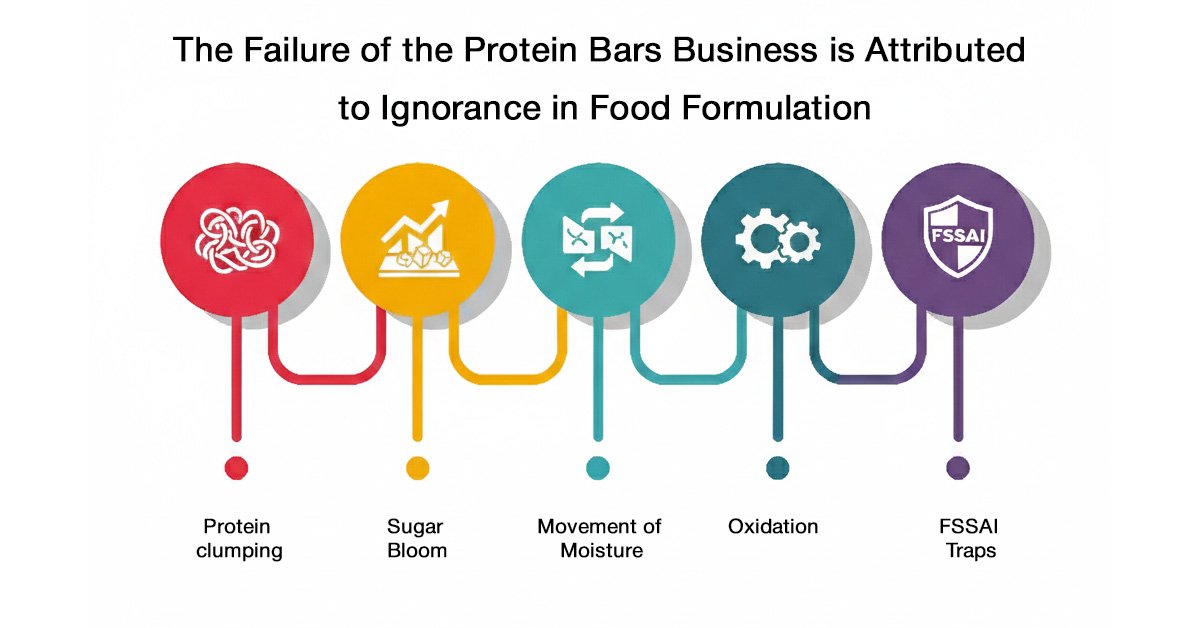 Instagram stories are full of protein bar business dreams: fitness influencers with their ripped abs on show, gym-goers who seek their macros, consumers who leave biscuits in favour of the healthy snack. However, 90% of protein bar businesses fail in 18 months. Why? After spending lakhs to master taste, founders encounter collapsing texture, FSSAI rejections and 3 months shelf-life disasters.