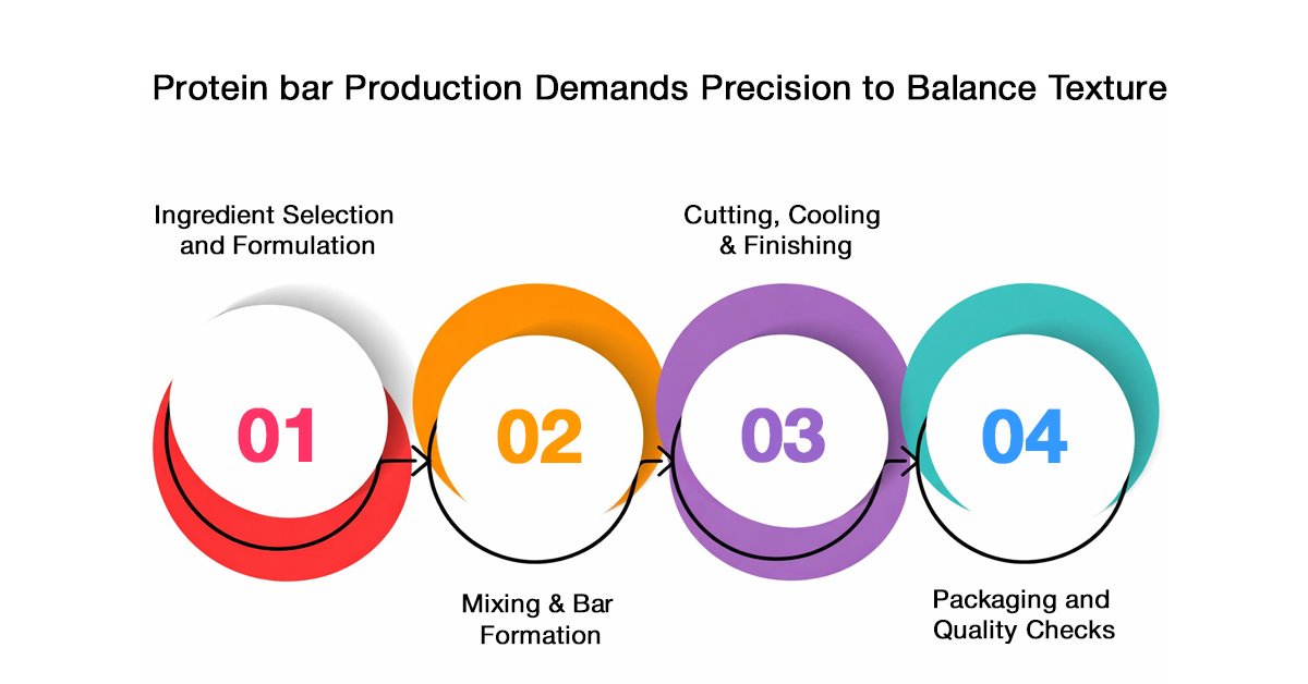 The first step is to select excellent protein sources like whey isolate, pea protein, or soy protein to fulfill clean-label requirements. Dates, honey, or glycerin are examples of the binding agents used to hold the structure, while nuts, seeds, and superfoods are the ones that give better texture and add nutritional value. Besides the other factors, formulations are tested for protein levels typically 1530 grams per bar as well as sugar content levels being low so that the products are healthy and even have diabetic claims. Manufacturers also produce personalized blends that fit with the latest market trends, including keto, gluten-free, and high-fiber variants. All formulations are produced in laboratories compliant with FSSAI regulations, which exclude restricted substances and maintain complete traceability from the sourcing of raw materials to the product.