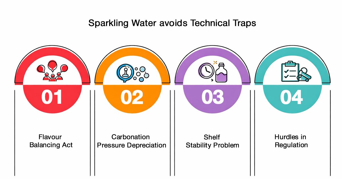 Sparkling water success depends on carbonation control, flavour balance, clean-label positioning, and shelf-life stability.